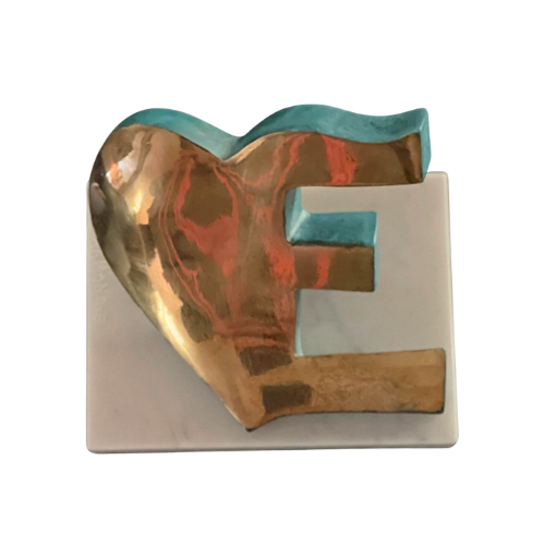 Sculpture en bronze poli avec patine verte, posée sur un socle en marbre blanc. La forme représente un E symbolisant l’Entraide, avec un cœur évoquant la solidarité. Une pièce compacte et raffinée, créée spécialement pour l’Entraide, pensée pour transmettre un message de soutien.